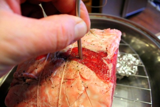 Insert the temperature-probe in the center of the roast. Push the probe down deeply — it should be half-buried in the meat.