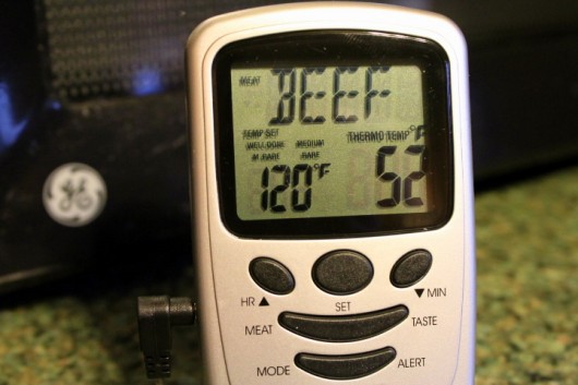 Ding! When the roast reaches 120°F., pull it out of the oven, and remove the temperature probe.