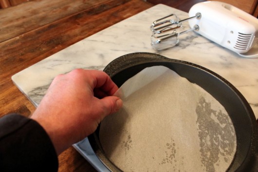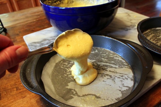 First, spray two cake pans with “Baking” spray. Baking spray contains flour. And for further insurance against sticking, line each pan with a cut out round of parchment or wax paper. Give the paper a light spray, too.