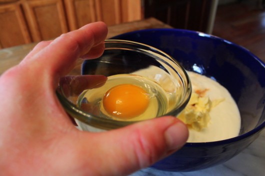 Finally, add the fresh, local eggs, which have come from happy, cage-free hens.