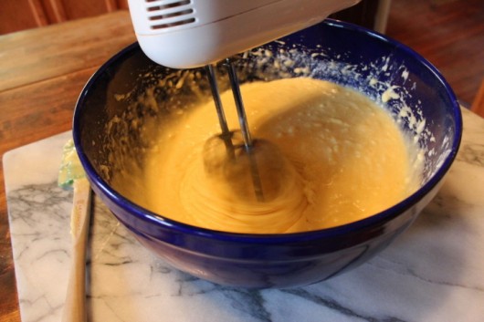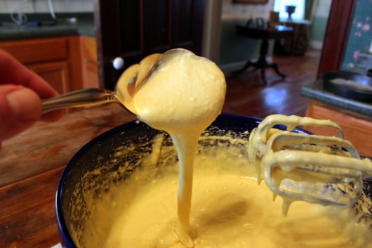 When dripped from a spoon, the batter, if properly beaten, will form a ribbon. A thick, delicious ribbon.