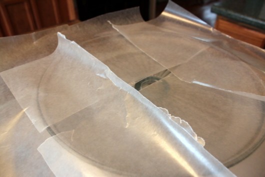 Select a platter or cake stand, and line it with 4 strips of wax paper, as shown. The reason for this step will be revealed in a moment.