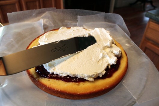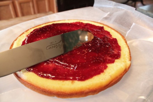 Gently place the leveled-off layer atop the wax paper. Then spread it with raspberry jam. Spread only to within one 1/2 inch of the edge. An off-set spatula, pictured above, is your friend here.