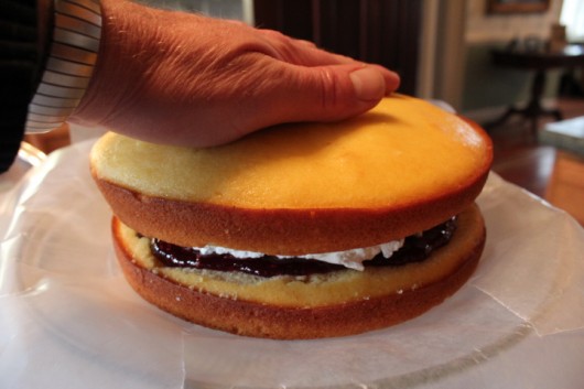 Place the second layer atop the first, and gently press down, encouraging the cream and jam to move towards the edge of the cake.