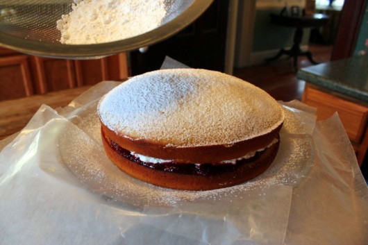 Dust the top with confectioners sugar (this is the traditional decoration for a Victoria Cake — it is never frosted, because it is meant for Afternoon Tea, not a “special occasion.”).