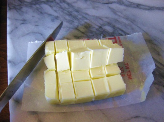 Cut the butter into a half-inch dice. Then add the butter to the flour, and pulse until the mixture resembles coarse meal.