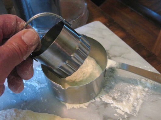 To keep the dough from sticking to my cutter, I dip the cutter into a measuring cup that contains a little flour.