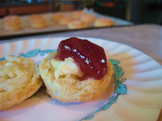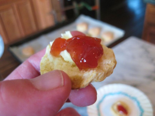 Today, I’m serving fresh-from-the-oven biscuits with butter and strawberry jam. Who’d like a taste?