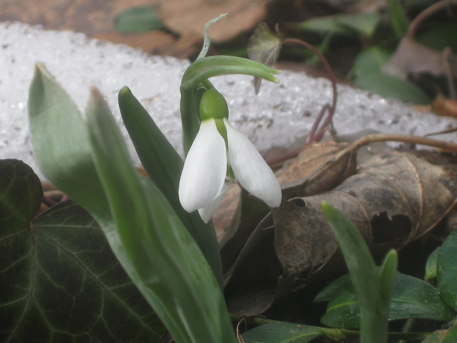 Above the south-facing stone wall, Galanthus nivalis bravely opened its nodding white bells in a setting of snow. Do you have these “snow drops” in your garden, too?