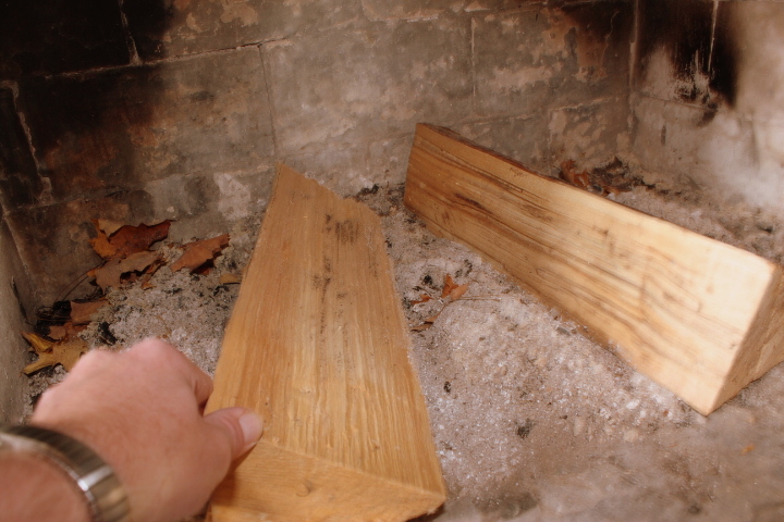 First, build a “cooking fire.” A cooking fire is one which produces abundant heat within minutes. As pictured above, set two pieces of seasoned, perfectly-dry wood in a triangular-fashion directly on the firebox floor.
