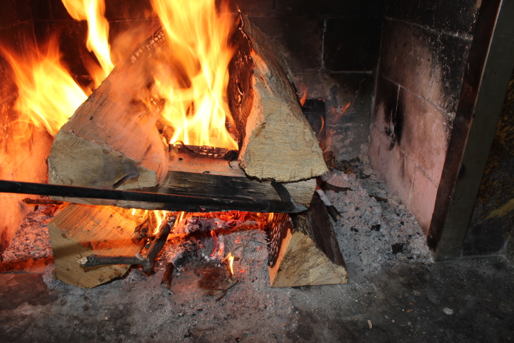 Every now and then, jostle the wood with your fireplace “poker.” This will will cause red-hot embers to fall upon the firebox floor. It is the embers which will heat your room and cook your food.