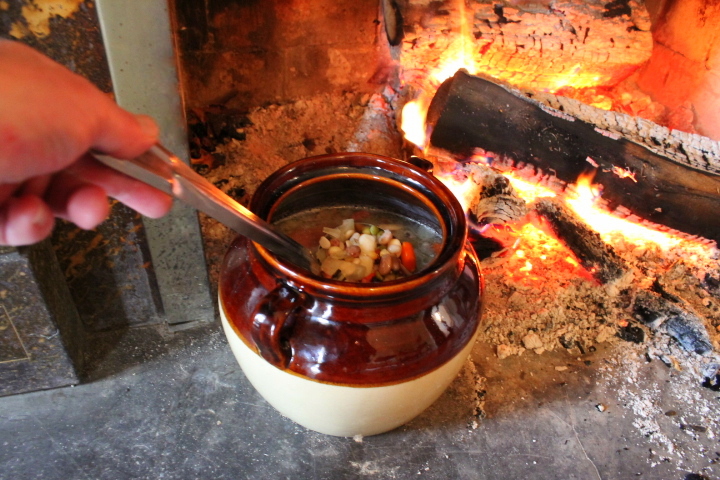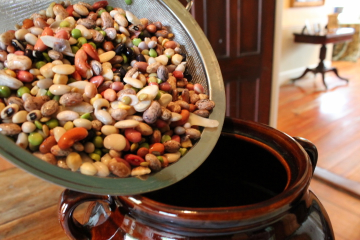 Pour the previously-soaked beans into a bean pot. (If you are making this stew on a modern stove top, see directions at the end of this article.)