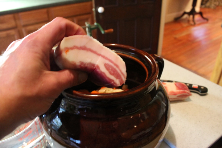 Now bury a tiny piece (1/4 lb) of salt pork in the bean and veggie mixture. We will not be eating this pork. Its purpose is to infuse the stew with intense flavor.