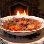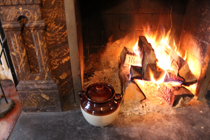 Position the pot on the hearth where it will simmer gently, but never boil. At my fireplace, the corner of the firebox is the ideal location. There the stew usually reaches the simmer-stage after 30 minutes.