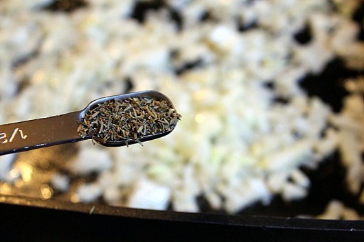 Add the minced onion and a big pinch of thyme to the skillet, and toss to coat.