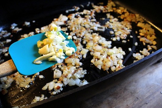 Then add the garlic to the onion mixture, and saute until fragrant — about 30 seconds. Remove from heat and set aside.