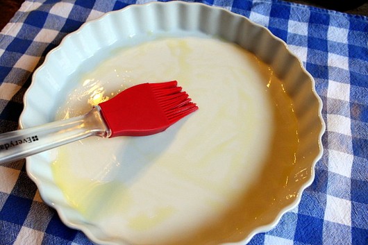 Now grab a 9-inch-diameter quiche dish, and lightly brush it with olive oil.