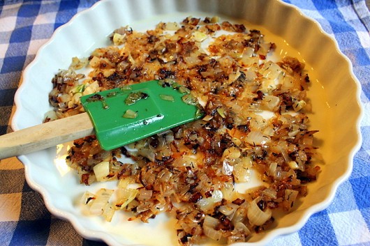 - Heat the oil and butter over medium heat in a heavy frying pan or electric skillet. When the butter melts, add the minced onion and thyme, and stir to coat. Then lower the heat, cover the skillet, and cook until the onion softens and browns slightly — about 8 minutes. Add the garlic, and sauté for until fragrant -- about 30 seconds. Tip the mixture into the oiled baking dish, and spread it out evenly.