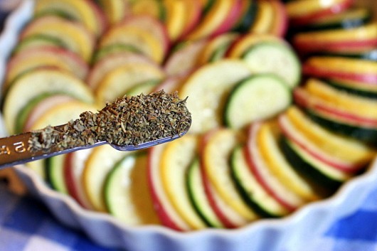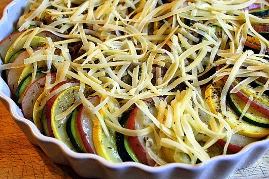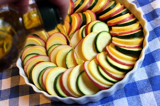 - Arrange, in alternating layers, the green zucchini, yellow squash, and red potatoes in concentric circles above the onion mixture. Drizzle the veggies with a little olive oil, and sprinkle with the salt, pepper, and Herbes de Provence.