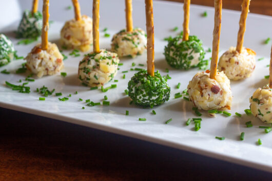 • Scoop the cheese mixture into a bowl. Form the cheese into bite-size balls, roll them in the herbs and/or nuts, and place them on a serving tray. Insert a pretzel stick in each ball, and serve!