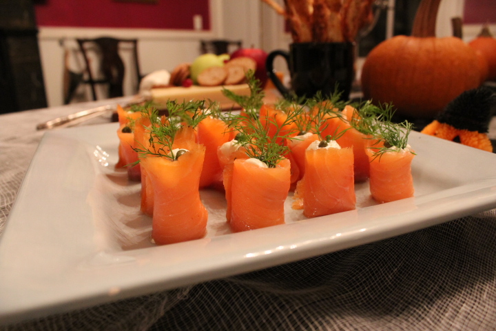 A caterer provided Salmon Soldiers. To make these, you take strips of Lox, roll them into a cylinder, and then fill them with cream cheese, capers, and fresh dill. Delicious!