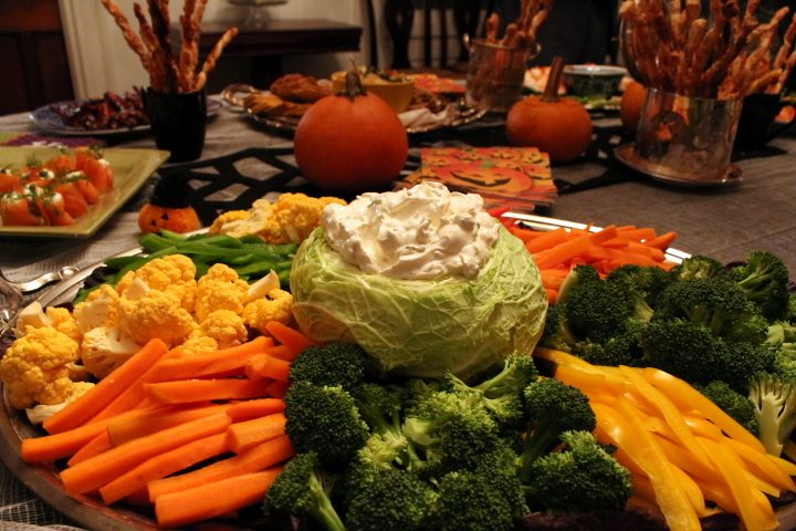 Looks like a fun time was had by all. Loved the costumes and pics of the food. I will totally steal the cabbage bowl idea for my next party I have used a red pepper and a little pumpkin before as I am GF and hate that everyone always puts the dip in bread! I am usually cursing under my breath….thanks guys..the only thing I can eat on this buffet is the veggies and you just put the $%#@* dip in bread. Love it Kevin.