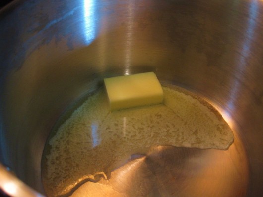 The cheese sauce begins with a flour-and-butter mixture, or  roux: In a saucepan set over low heat, melt the butter. You don’t want the butter to color any more than a pale yellow. As assurance against browning, I always lift the pan about an inch or two above the flame.