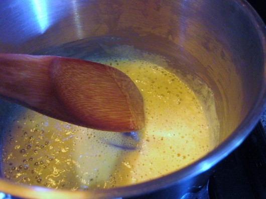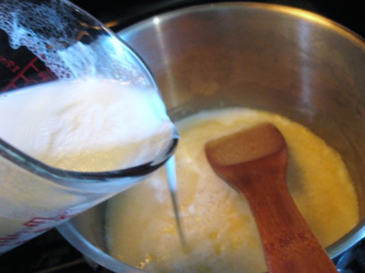 2. In the saucepan, melt butter over low heat; when melted, add the flour and stir, with a wooden spatula,  until smooth and bubbly. Then add the hot milk, increase heat, and stir constantly until the sauce thickens and reaches a boil.