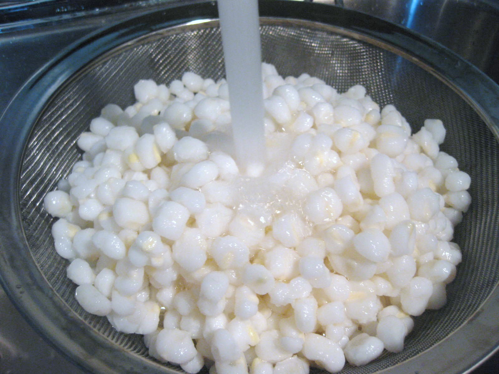 1. Pour the hominy into a colander, and then run cold water over the kernels to remove the taste of the can.