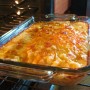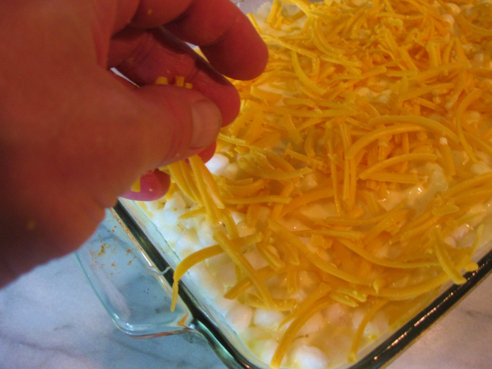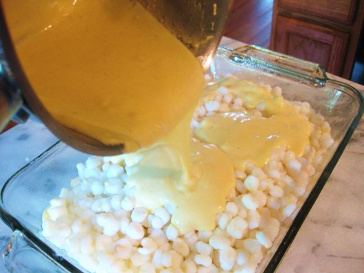 Pour a quarter-cup of the cheese sauce into a buttered (or non-stick-sprayed) baking dish. Then pour on the hominy. Pour the remaining cheese sauce over the hominy, and shake the dish to help the sauce settle between the kernels.