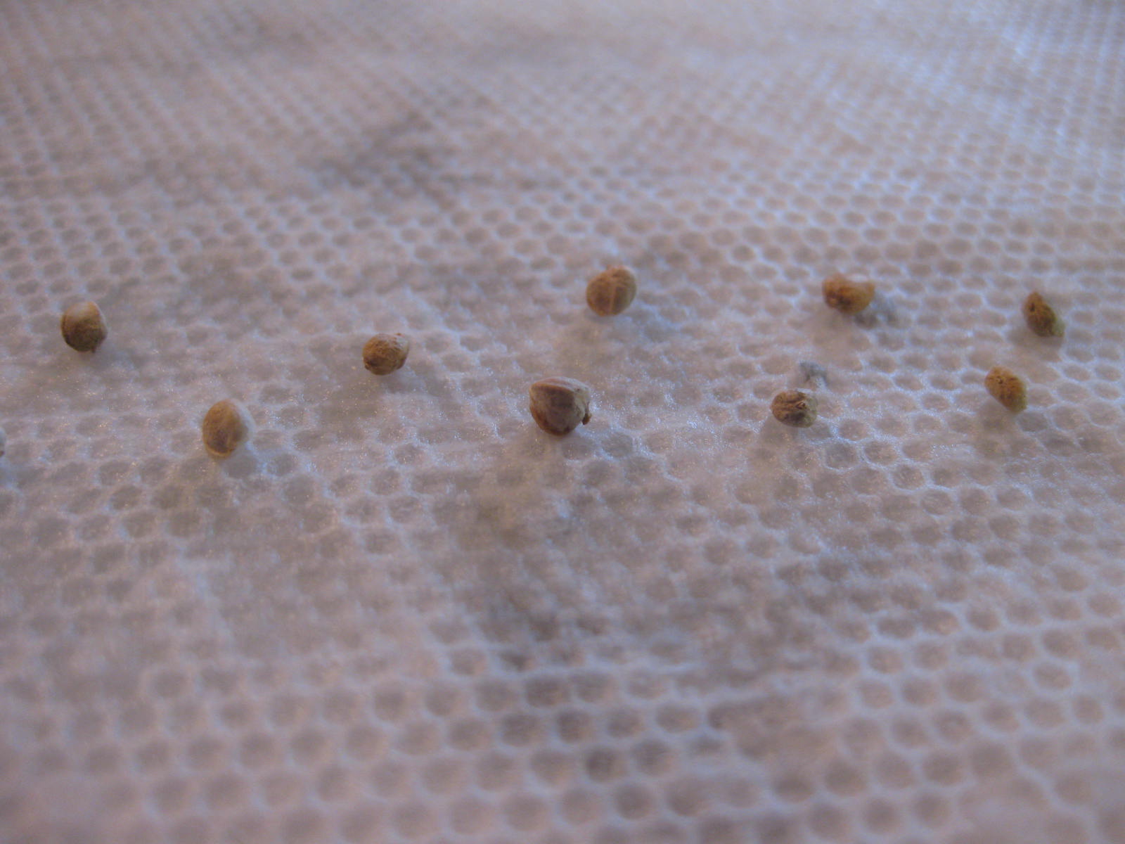 Spritz the paper towel with water just to dampen it. Then arrange 10 seeds on the lower portion of the towel. Fold the towel so that both sides of seeds receive moisture.