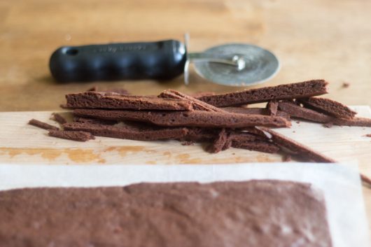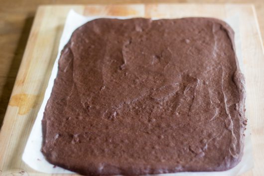 - In a medium bowl, whisk together the flour, cocoa, baking powder, and salt. Set aside. In a large bowl, whisk together the butter and sugar until thick. One at a time, whisk in the eggs, followed by the vanilla extract. Add the dry ingredients to the wet, and beat with a stout spoon until perfectly smooth. Scoop the batter onto the prepared baking sheet, spread it out evenly with an offset spatula, leaving a narrow border of exposed parchment paper around the edges. Bake until set -- about 10 minutes. Transfer the pan to wire rack to cool..