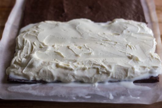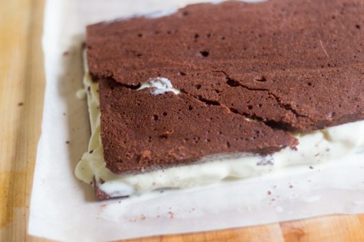 - Use the parchment paper to transfer the cooled cake to a cutting board. Using a sharp knife or a pastry cutter, trim the cake to achieve a 10x14- (or 9x13-) inch rectangle. Cut the cake crosswise in half, and scoop the ice cream on top of one half. Spread the ice cream all the way to the edge with the help of an offset spatula. Then take hold of the parchment paper, and flip the second half of the cake of the ice cream. Tightly wrap the big sandwich in plastic wrap, and freeze until solidly frozen -- at least 8 hours.