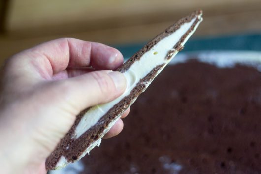 And flip it over the ice cream-covered portion. My top layer cracked a bit when I flipped it, but that’s okay. Cracks in the cake won’t affect the final, frozen product.