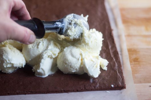 And top one half with a full quart of slightly softened vanilla ice cream! Just plop it on with a large ice cream scoop or spoon.