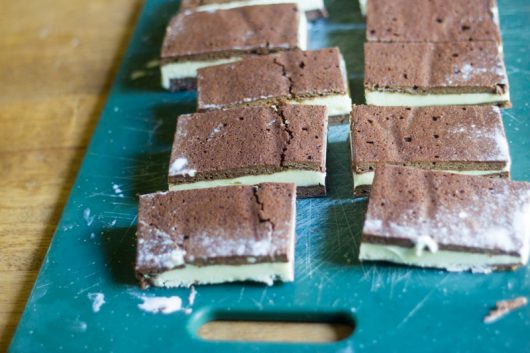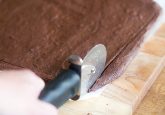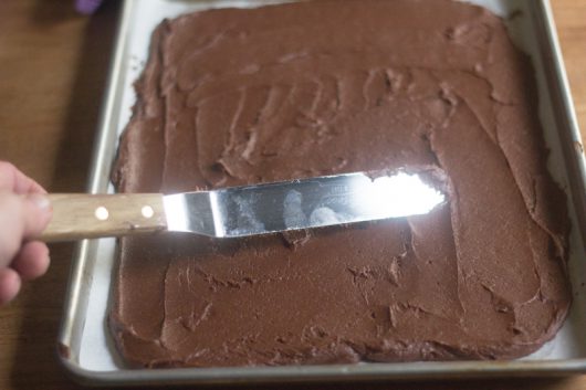 Grab a knife or a pastry cutter, and trim the cake to achieve a 10×14- (or 9×13-) inch rectangle.