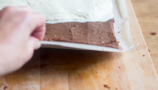 When the cake is completely cool, pick up the ends of the parchment paper, and transfer the cake to a cutting board.