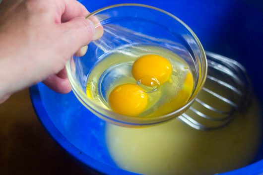 One at a time, whisk in 2 large eggs…