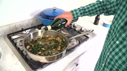 - Making the mushroom filling -- Warm the oil and butter in a 12-inch skillet over medium heat. Add the onion, mushrooms, spinach, rosemary, and seasonings. Cover the pot and let the onions and mushrooms steam until soft -- about 2 minutes. Remove the cover, and toss the ingredients about with a spoon or spatula until the mushrooms have rendered their juices -- about 5 minutes. When juices have evaporated, stir in the vermouth. Cook until the vermouth evaporates -- about 1 minute.