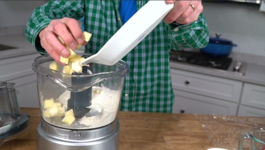 - Making the pastry dough -- Tip the flour, salt, and butter into the workbowl of a food processor. Pulse the machine 10 times just to break up the butter. Then add the ice water, and process until the dough begins to mass on the blade -- 5-10 seconds. Dump the dough onto a non-floured work surface, and gather it into a ball. Flatten the ball into a disk, and wrap in plastic wrap. Refrigerate for at least 1 hour.