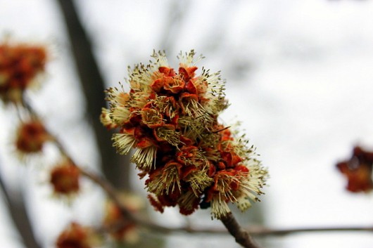 These are the flowering branches of the Silver-leaved maple, Acer saccharinum. The copper petals and whisker-like stamens are a fun sight for my winter-weary eyes.