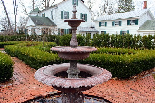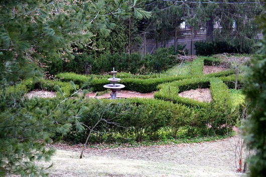 If we peer over the pool garden’s west gate, we can see the boxwood garden below. Please note the light-colored branches on the left.
