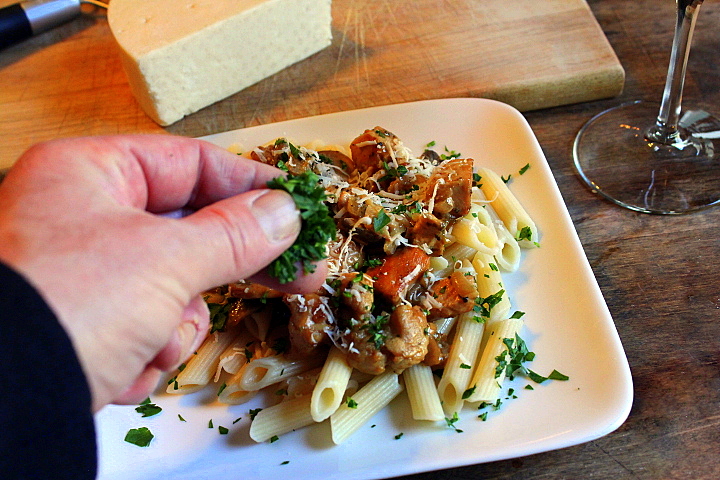 To serve, put some pasta on a plate, and top it with a generous amount of the chicken mixture and a healthy amount of freshly-grated Parmesan cheese.