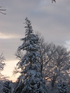 Here on the east lawn, three ancient sisters — pine, locust, and beech — model their winter-wear. (Click to enlarge.)