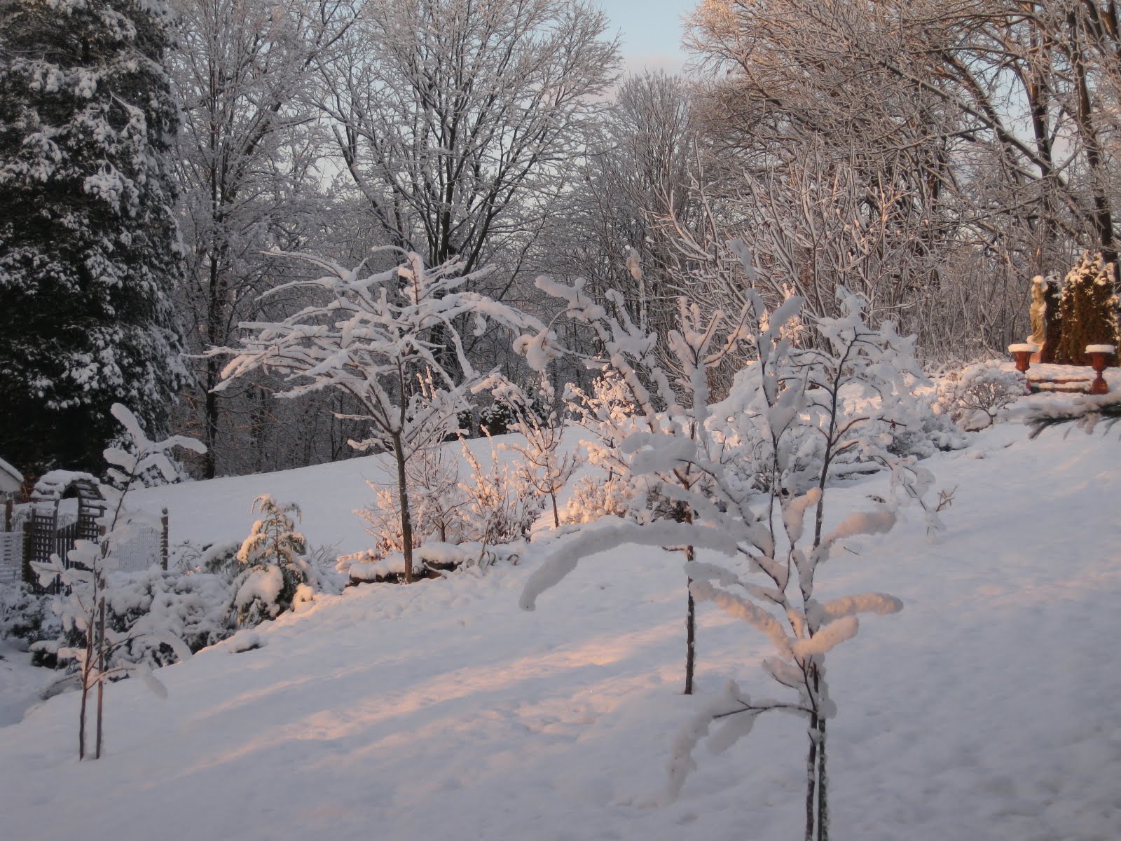 The season’s first snow fell steadily yesterday evening, as if on cue for today’s blog and my birthday. How I love to wake up to a white, frosty morning! Above is the view from the Woodland Garden, facing south toward the pool (click to enlarge). And here are other snow-cloaked forms and traceries at A Garden for the House, captured today, at sunrise: