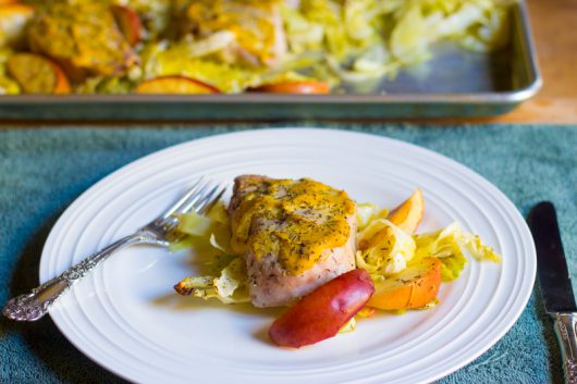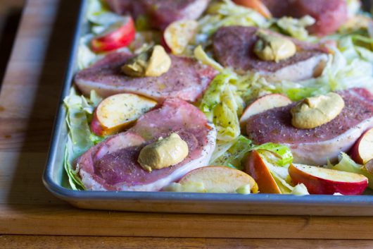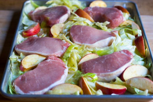 We’re fond of pork chops, Mr. Fox and I. We love them broiled, baked, or grilled. We also love them roasted on a sheet pan, alongside wedges of red apple and ribbons of green cabbage. This latter preparation is a complete meal that cooks up in just 30 minutes, and oh, man — it’s delicious!