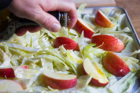- Spray a large sheet pan with non-stick vegetable spray, and heat the oven to 425°F. Tip the ribbons or wedges of cabbage onto the sheet pan, and drizzle them with olive oil and a sprinkling of salt and pepper. Toss to coat. Core the apples, and cut them lengthwise in half. Then cut each half into quarters or eighths. Scattered the apples over the cabbage, and season them with olive oil, salt, and pepper. Roast in the preheated oven for 10 minutes.