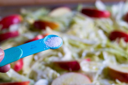 Scatter the apple wedges over the cabbage, and then give them a drizzle of olive oil…
