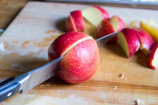 Cut each apple lengthwise in half, and cut each half into quarters. If you’d like thinner apples wedges, just cut the halves into eighths.