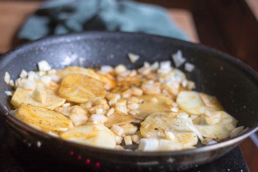 - Put the potato slices and onion in the skillet, add a sprinkling of salt and pepper, and toss to coat. Then cover the skillet, reduce the heat to medium-low, and let the veggies sweat until they soften (the potatoes should be fork-tender) – 12-15 minutes. Then add the garlic, and sauté for 1 minute. Transfer the potato mixture to the large bowl, along with the roasted red pepper.